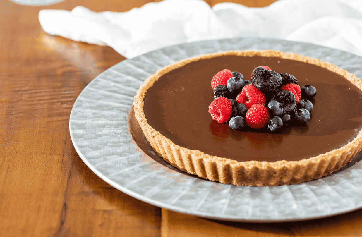 Món Bánh Pie Socola và Mận khô California là một món tráng miệng đầy ấn tượng và hoàn hảo cho bất kỳ dịp nào! Lớp mousse socola mềm mịn như lụa được đổ vào lớp vỏ bánh làm từ bánh quy graham và bánh pretzel, sau đó phủ thêm một lớp kem tươi đánh bông cùng trái cây mọng tươi tắn – bạn còn mong đợi gì hơn thế nữa?