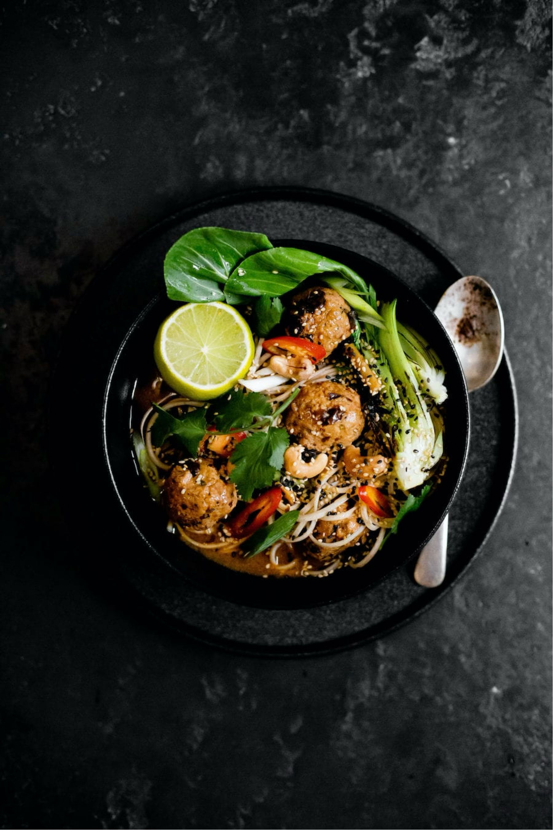 Đại sứ thương hiệu kiêm đầu bếp tài năng của chúng tôi, Peter Sidwell, đã sáng tạo ra món Thịt viên châu Á pha trộn thịt và thực vật, thay thế một phần thịt bằng mận khô California mọng nước và hạt điều thơm ngon.